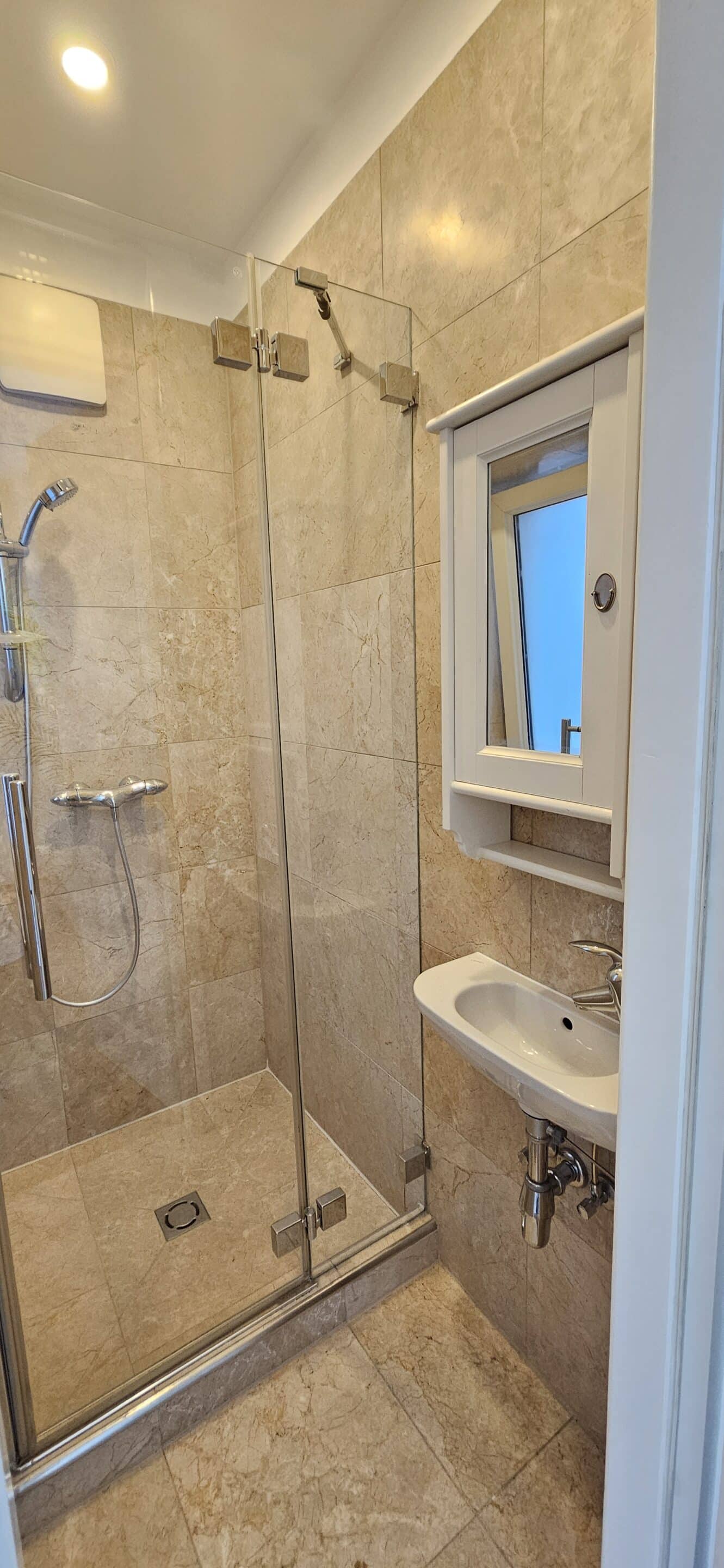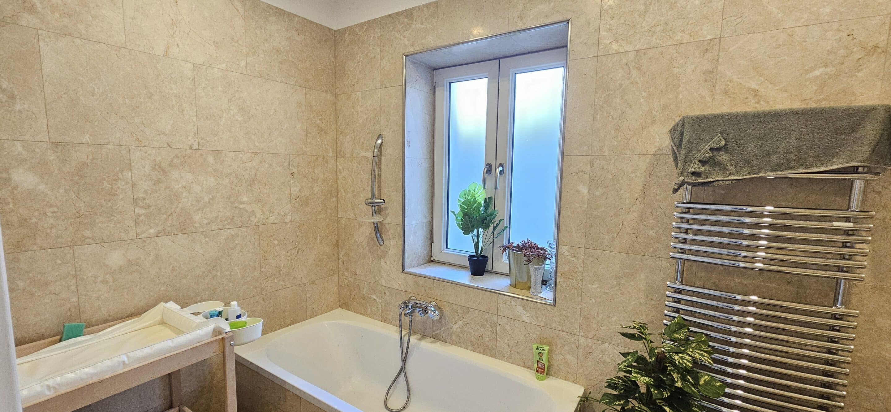 1 Badezimmer mit Fenster, Dusche und Badewanne