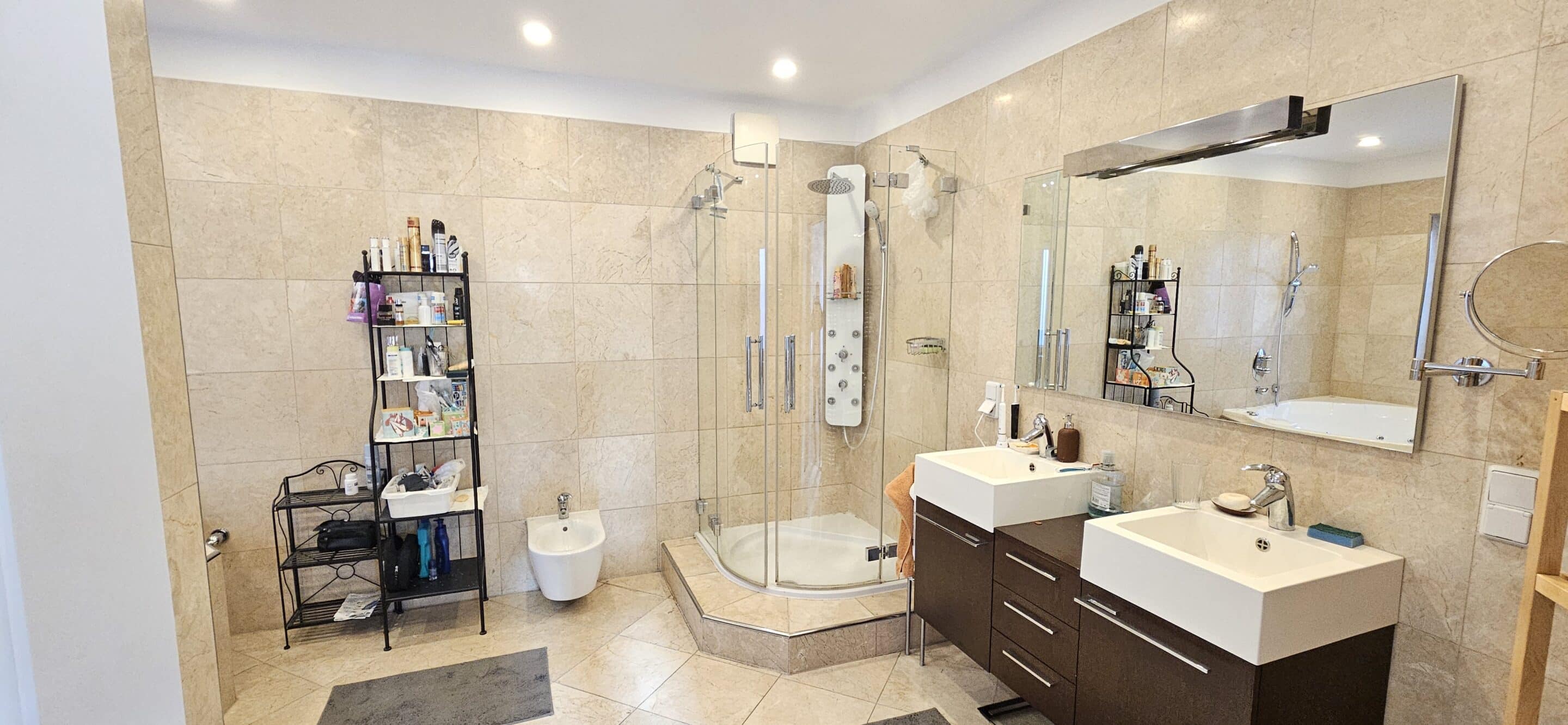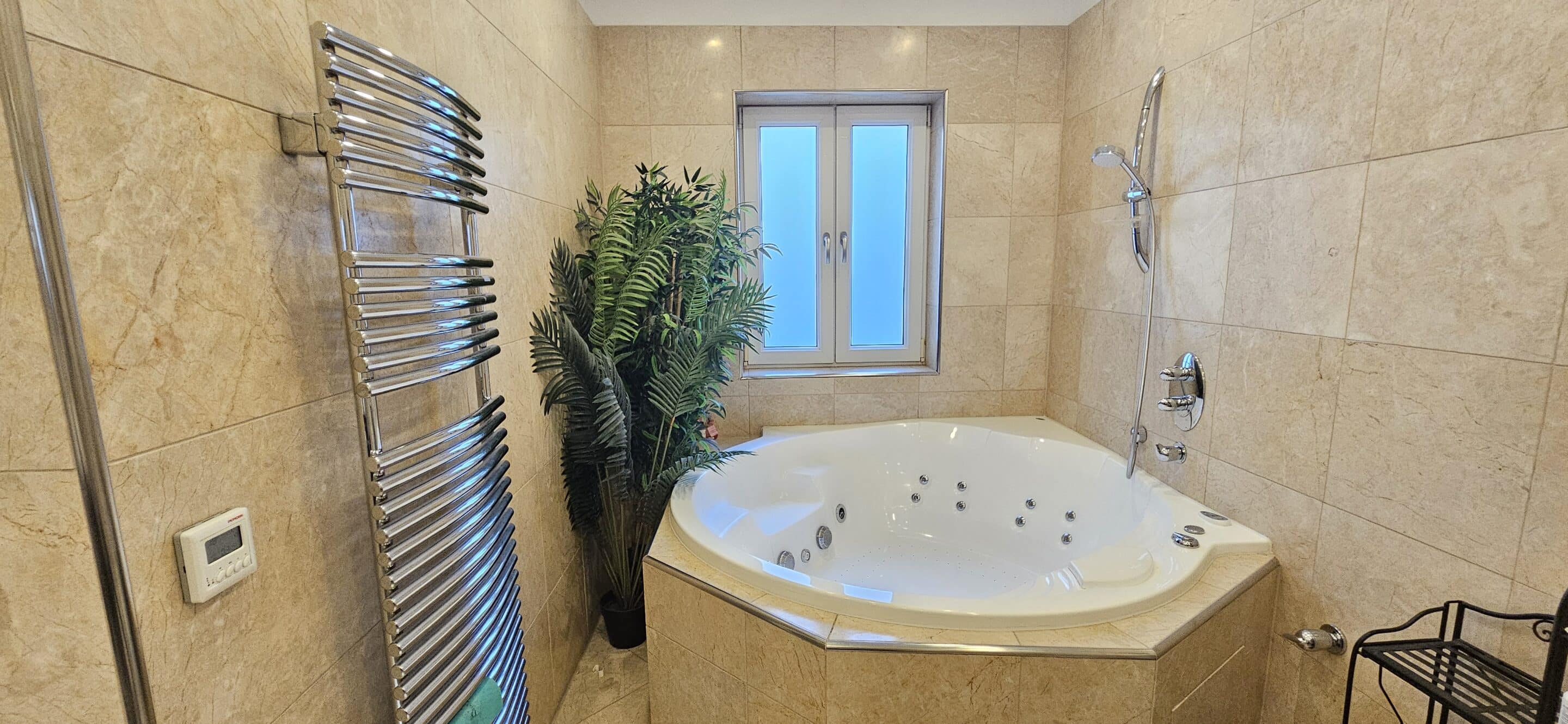 luxuriöses „en suite“ Badezimmer mit WC, Whirpool, Duschkabine mit Hydromassage, Fenster und Naturstein-Fliesen,