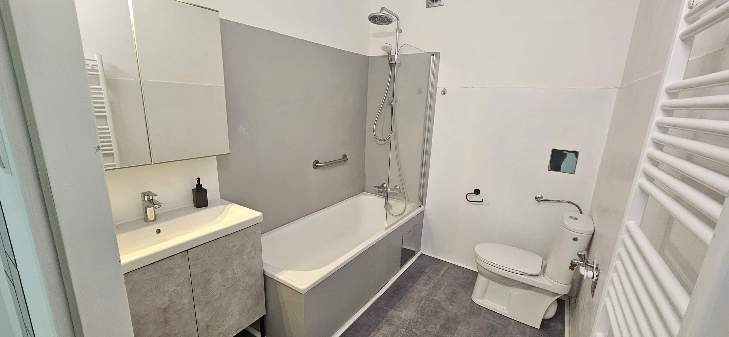 Badewanne mit Duschtrennwand und Rainshower, WC der Marke Laufen und Handtuchheizkörper;