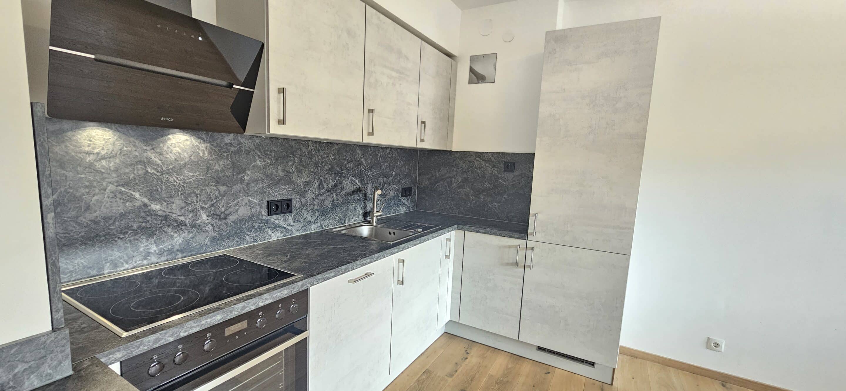 Eichenparkettboden in den Wohnräumen sowie hochwertiger rutschfester Vinylboden im Badezimmer;
